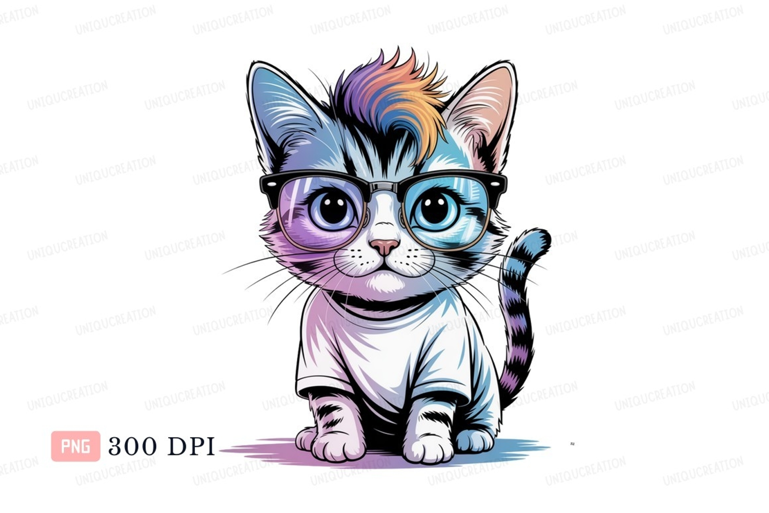 Hipster Cartoon Animal Cute T-shirt Colorful Hair Cat Glasses Pet