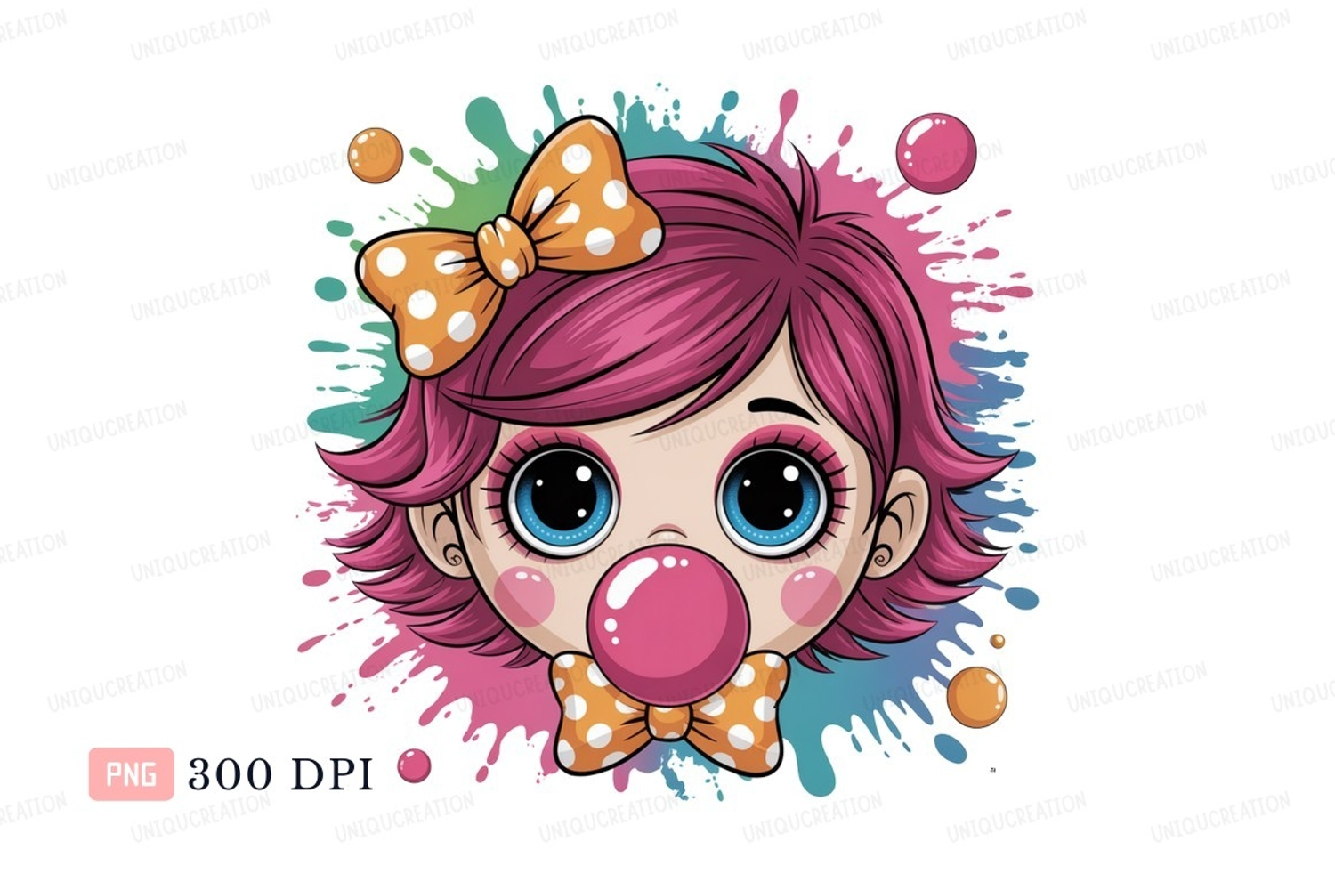 Pink Girl Dots Orange Blue Hair Bow Polka Eyes Bubblegum