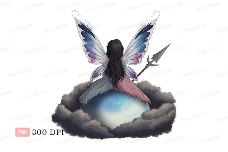 Fantasy Dark Fairy Blue Clouds Wings Magical Spear Ethereal Orb