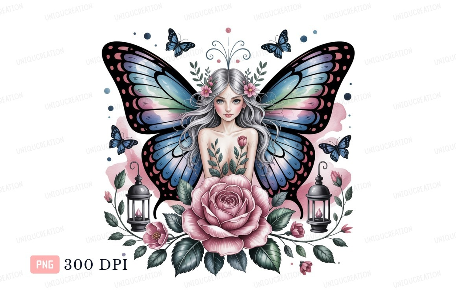 Fairy butterfly woman pink rose lanterns wings example image 1
