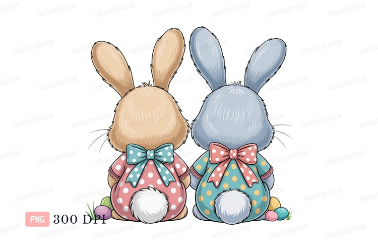 Two bunnies wearing polka dot outfits easter eggs example image 1