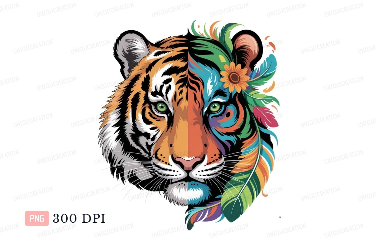 Vibrant tiger face with colorful feathers animal orange example image 1
