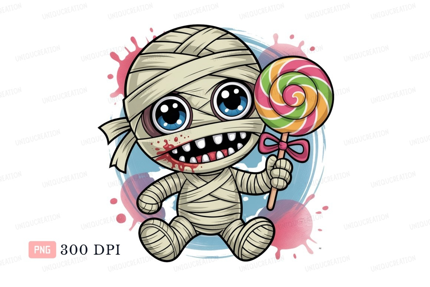 Bandaged creature holding colorful lollipop mummy cartoon example image 1