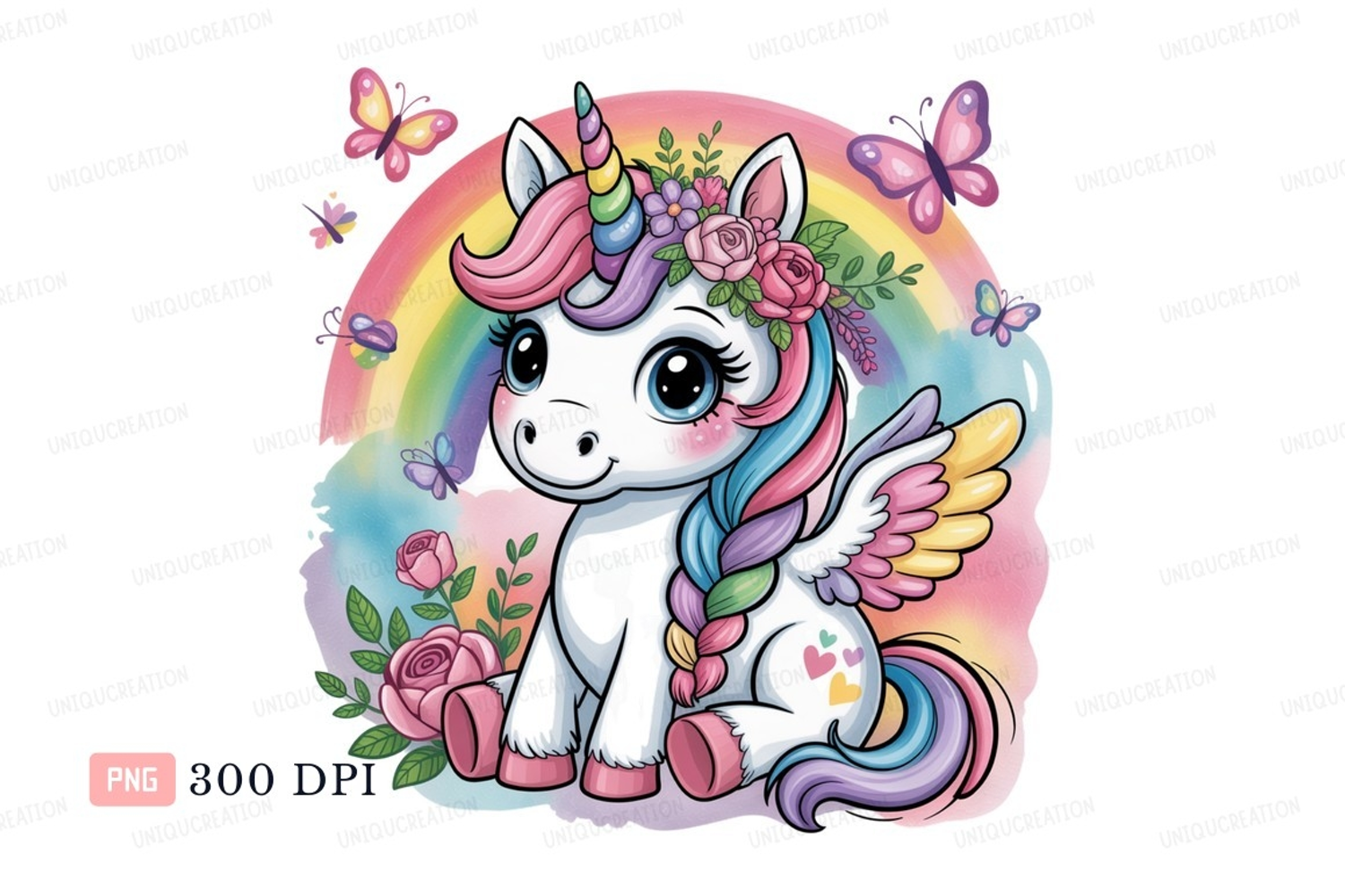 Cartoon Fantasy Whimsical Cute Flowers Unicorn Rainbow Wings Magical Butterflies