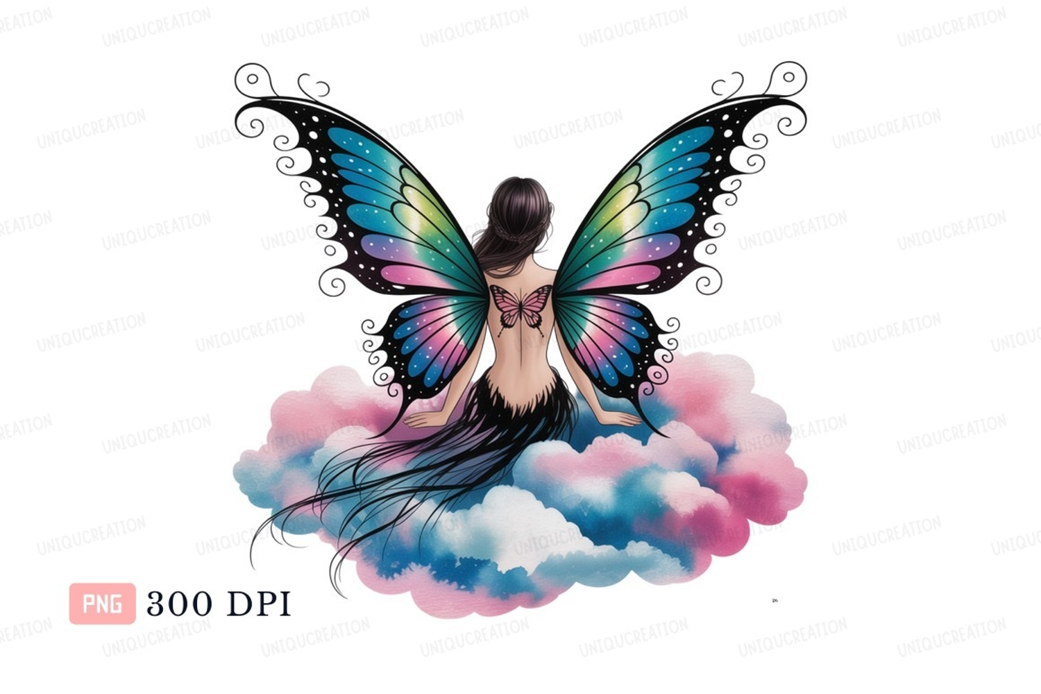 Fantasy Black Pink Green Woman Blue Butterfly Clouds Wings Ethereal