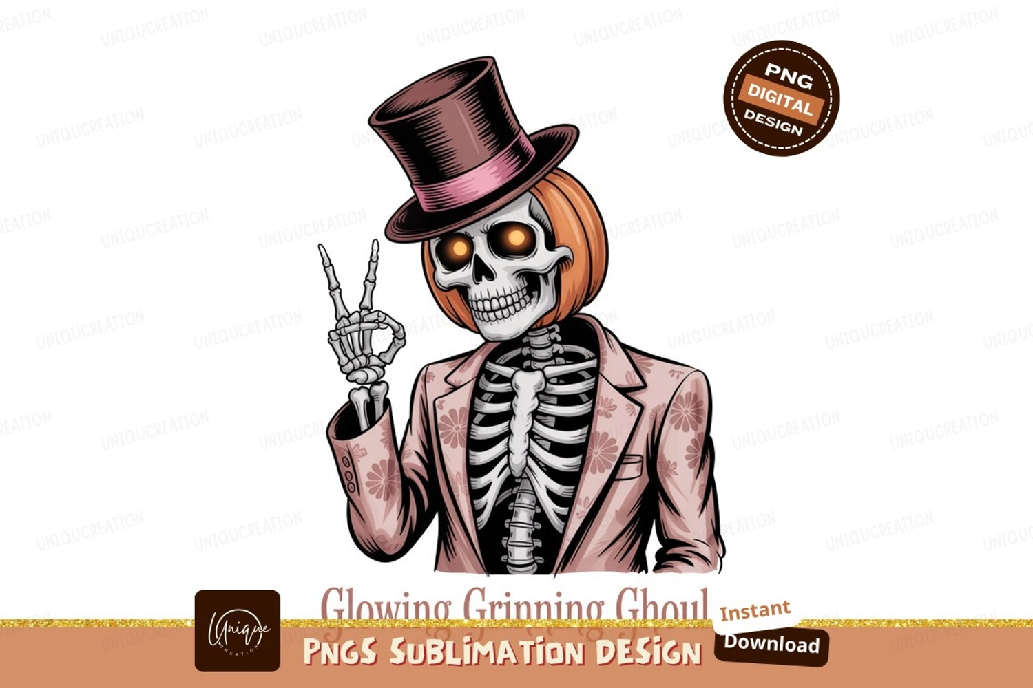 Skeleton pumpkin head top hat suit peace sign image example image 1