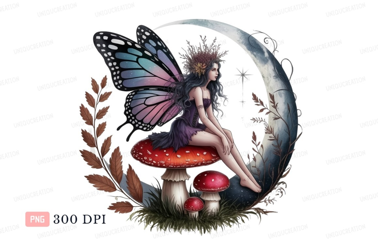 Fairy sitting on mushroom under moon wings fantasy example image 1