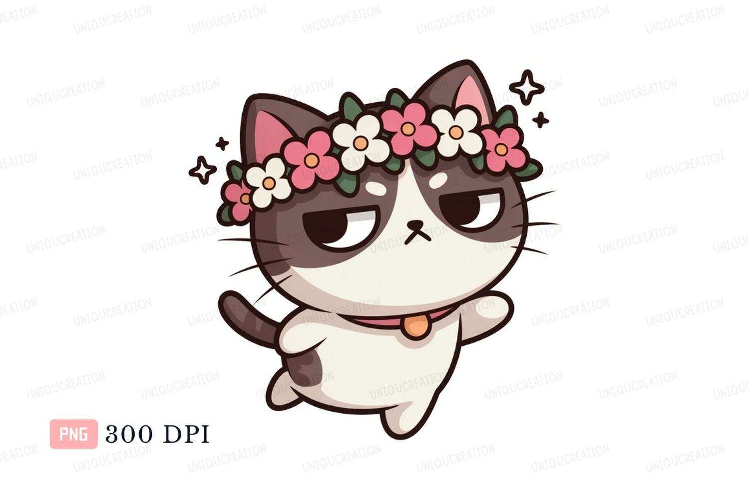 Cartoon Animal Pink Green Flower Crown Cat White Collar Grumpy