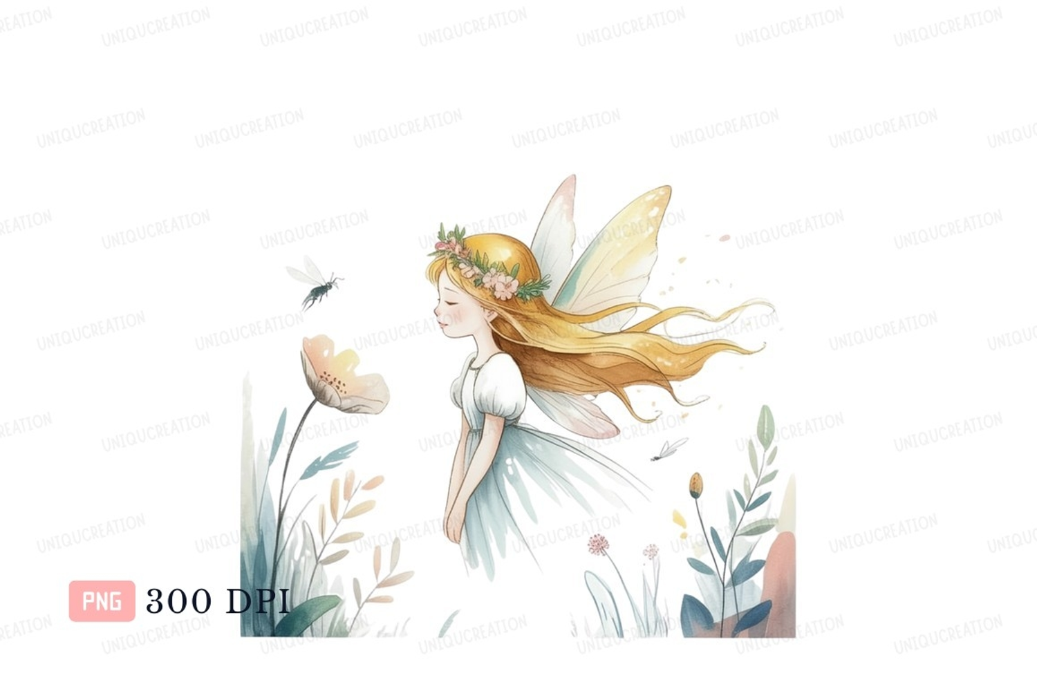 Illustration Fantasy Nature Girl Flower Fairy Crown Insect Wings Blonde