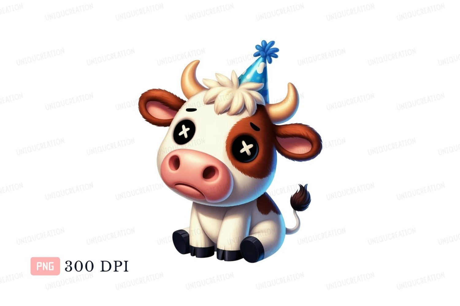 Illustration Cartoon Party Clipart Brown Blue Hat White Cow Sad