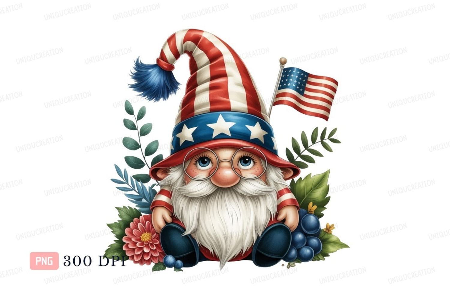American Flowers Leaves Berries Red Stripes Flag Patriotic Stars Gnome