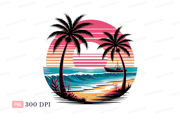 Vintage Retro Summer Ocean Beach Sunset Tropical Boat Palms Waves