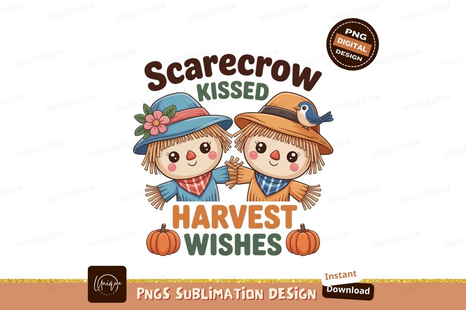 Similar Design Products to Cute scarecrows holding hands with bird and pumpkins