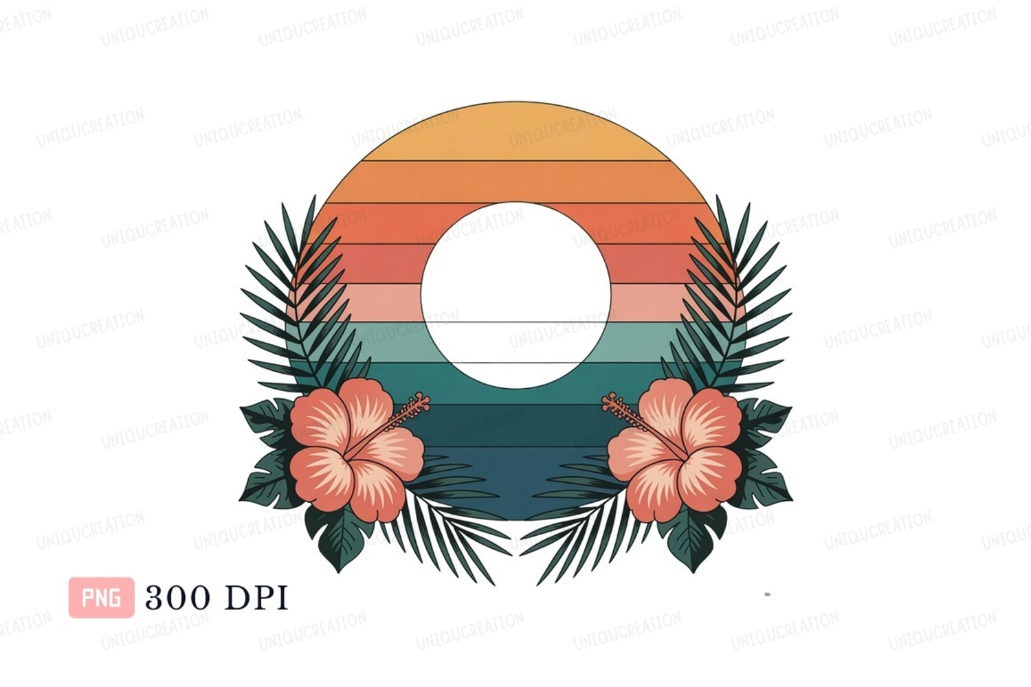 Vintage Retro Floral Leaves Sunset Frame Hibiscus Tropical Circle Palm