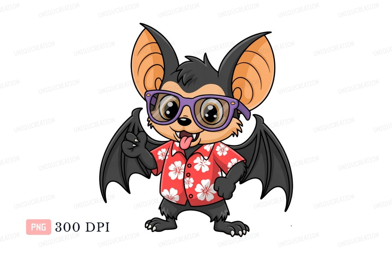 Cute bat wearing glasses and Hawaiian shirt cartoon example image 1