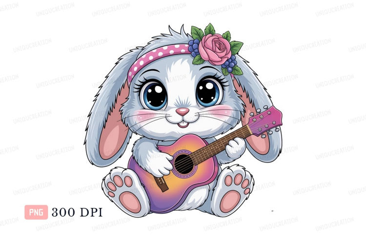 Cute bunny playing guitar with flower headband rabbit example image 1