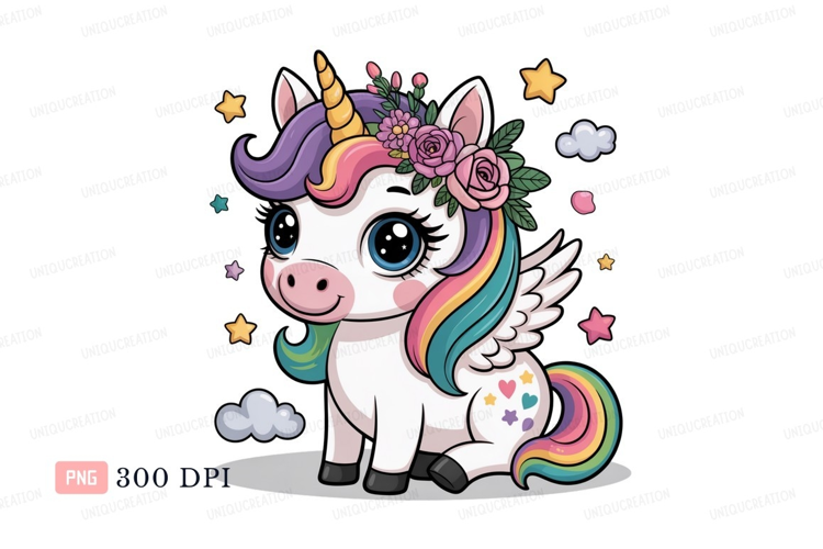 Cute unicorn with rainbow mane and floral crown fantasy example image 1