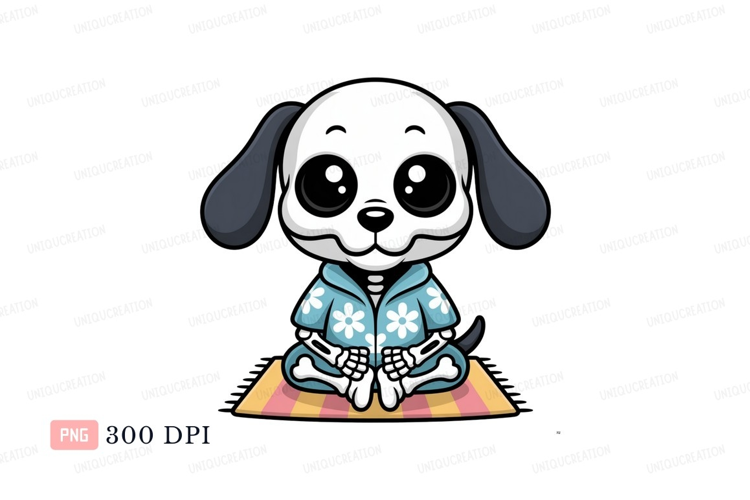 Skeleton dog wearing pajamas sitting on mat image example image 1