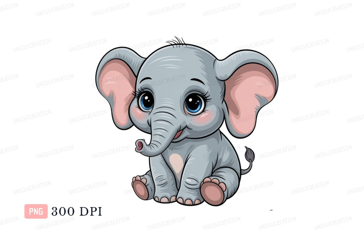 Cute baby elephant with big blue eyes cartoon grey example image 1