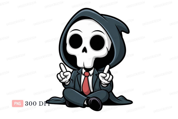 Character Cartoon Black Skull White Suit Tie Grim Reaper Meditating