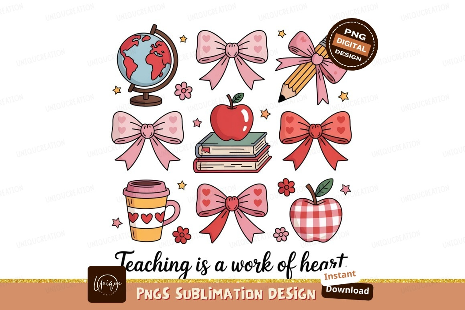 Pink bows red apple globe pencil coffee cup books image example image 1