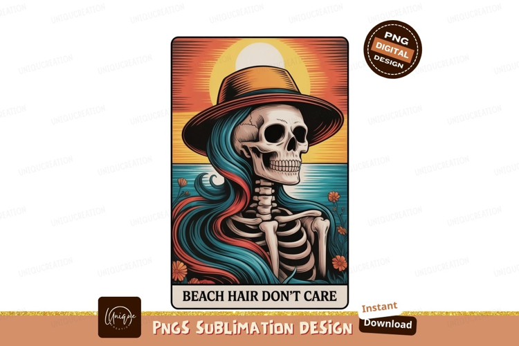Skeleton wearing hat with flowing hair beach ocean example image 1