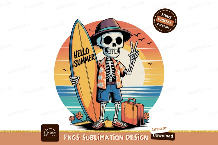 Skeleton surfer with surfboard and suitcase summer example image 1