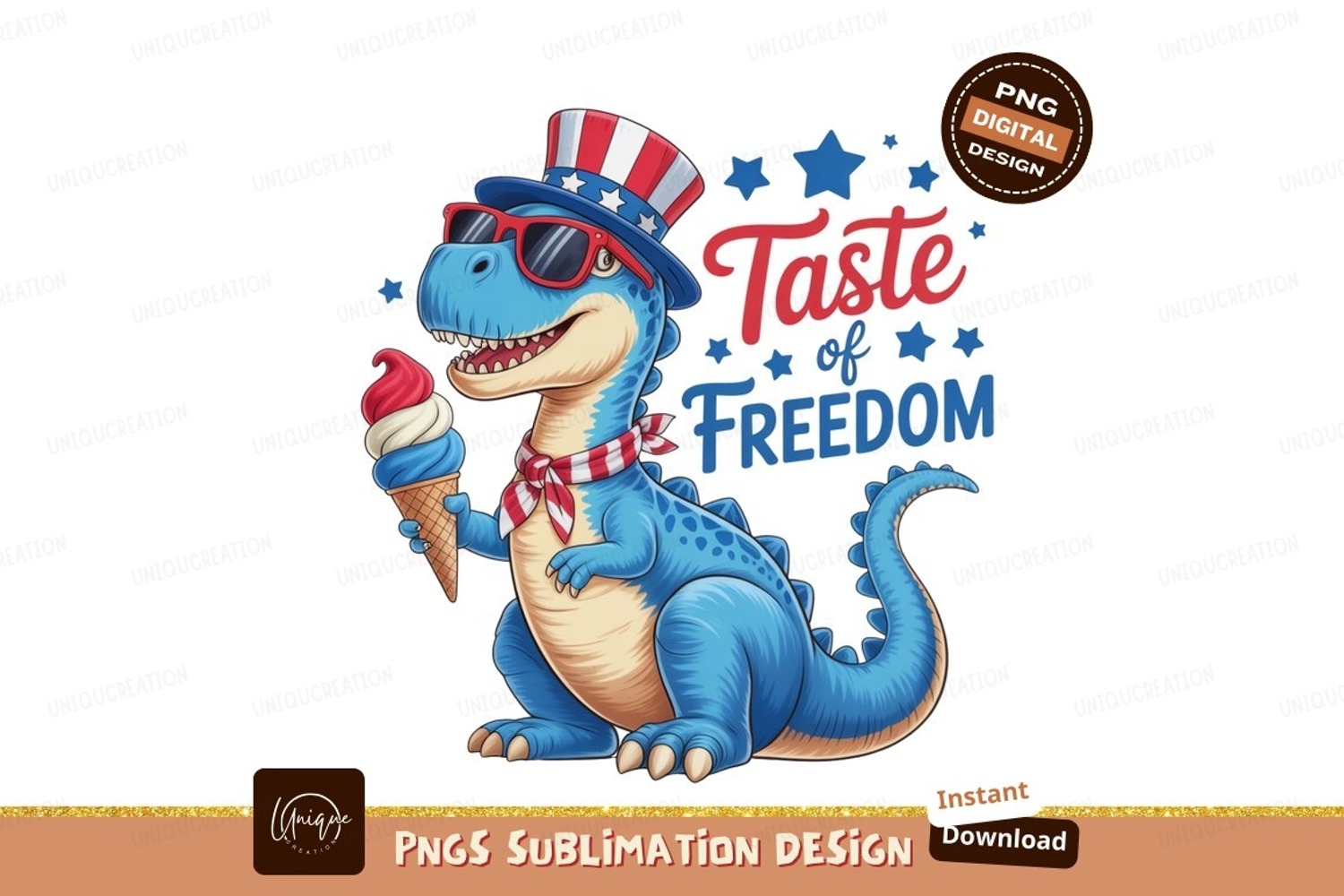 Blue dinosaur wearing patriotic hat and sunglasses holding i example image 1
