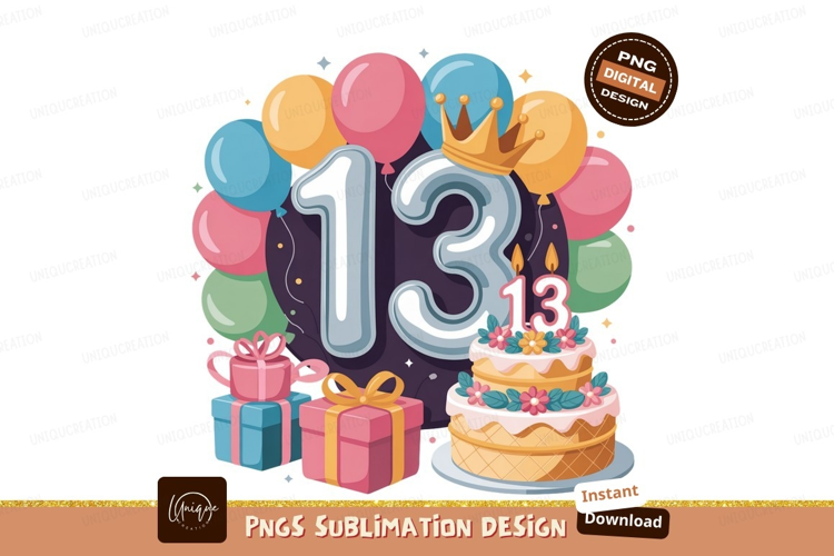 Similar Design Products to Thirteen birthday celebration with balloons and cake