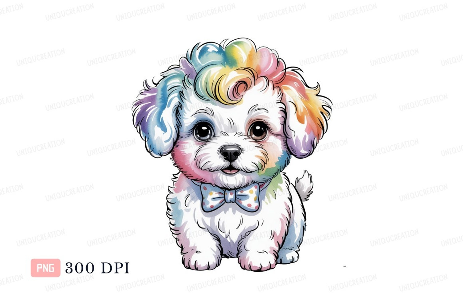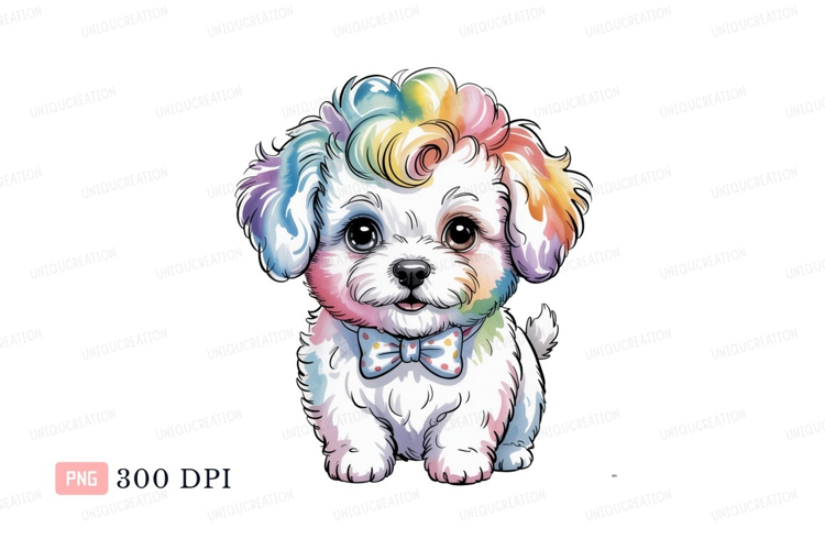 Fluffy puppy with rainbow hair and bow tie white example image 1