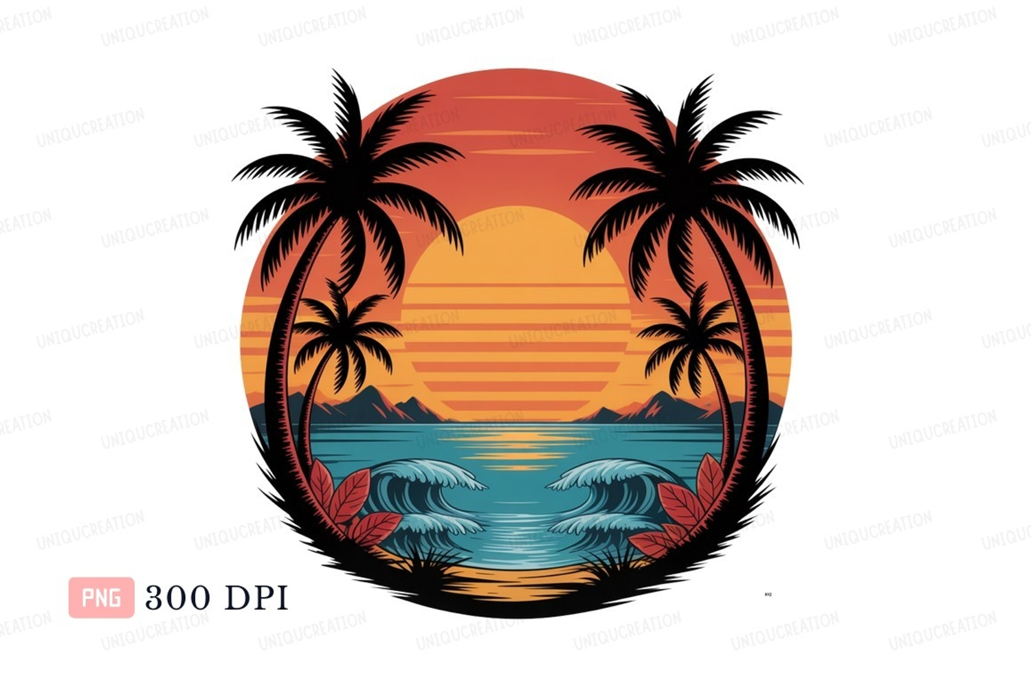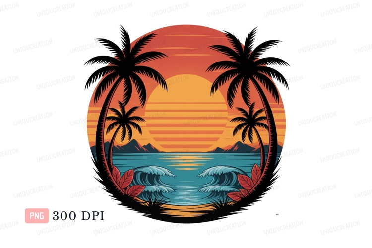 Vintage Retro Ocean Water Beach Sunset Tropical Landscape Palms Waves