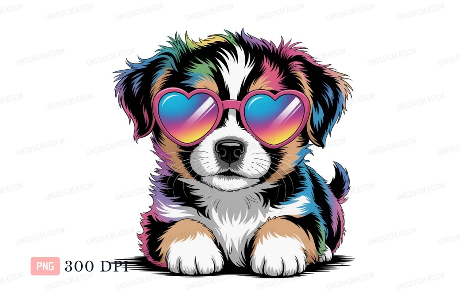 Colorful fluffy puppy wearing heart sunglasses rainbow example image 1