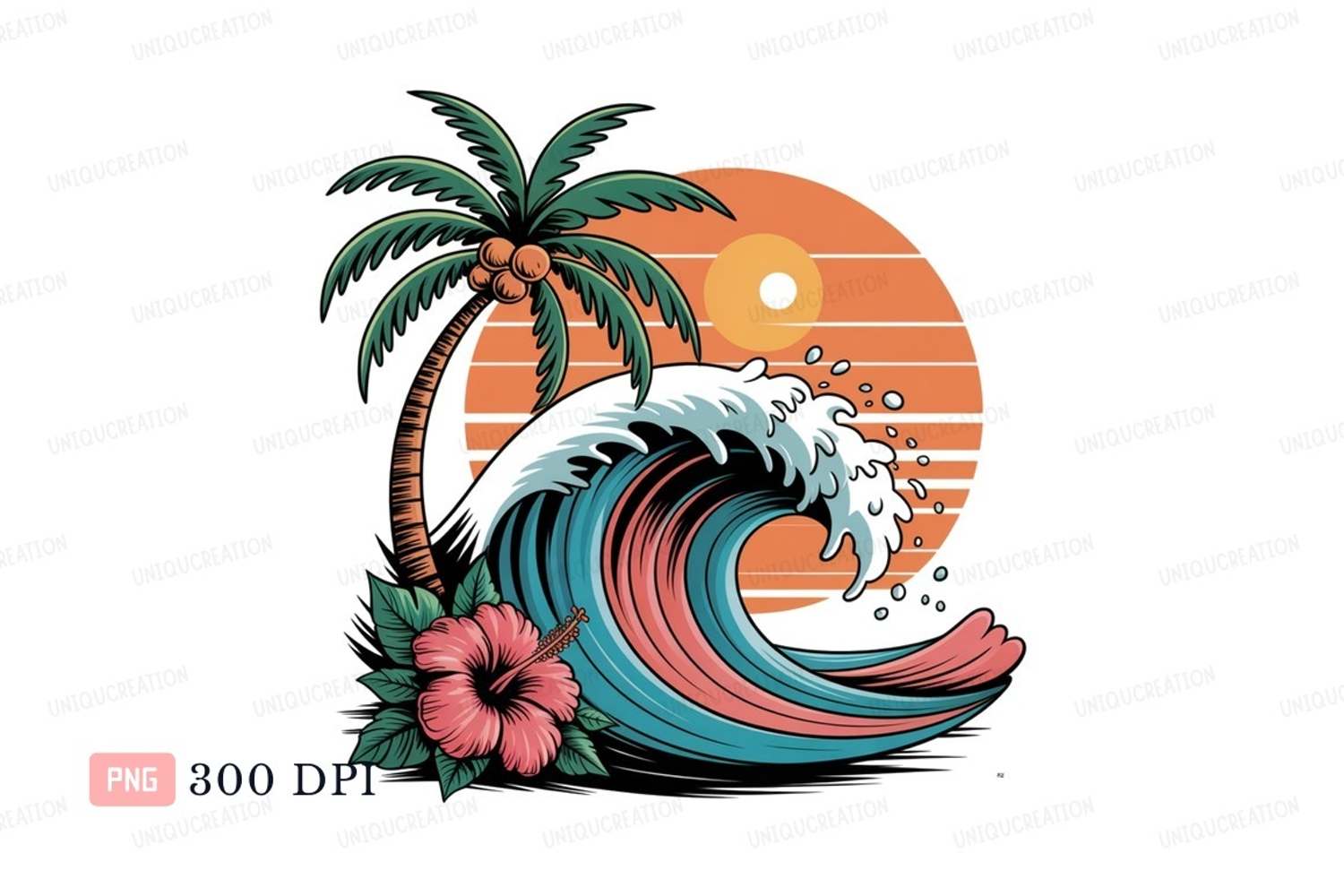 Palm tree wave hibiscus sunset coconuts ocean