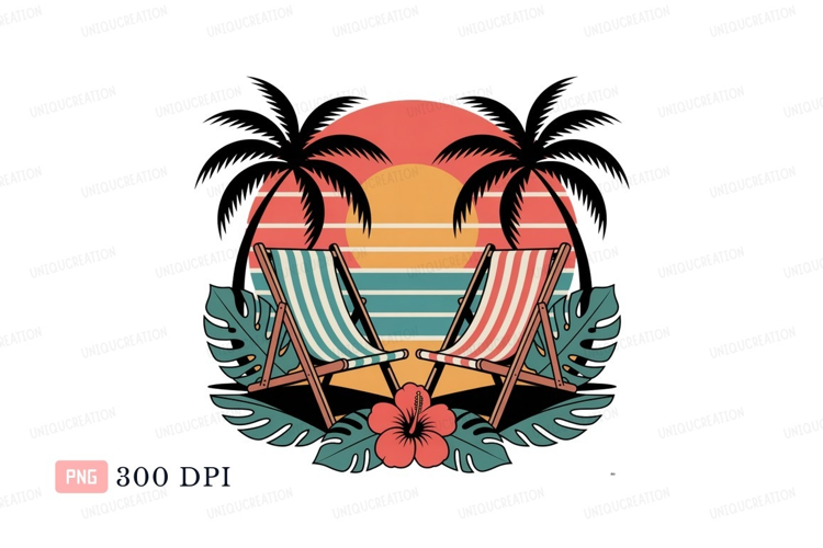 Retro Summer Ocean Beach Sunset Tropical Vacation Chairs Palms Relaxation