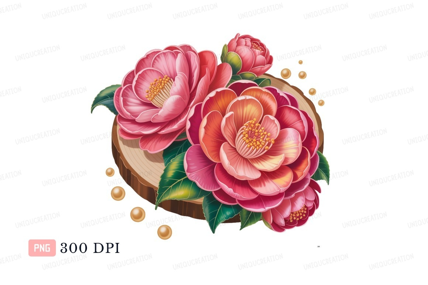 Similar Design Products to Pink coral camellia blooms wood slice green leaves