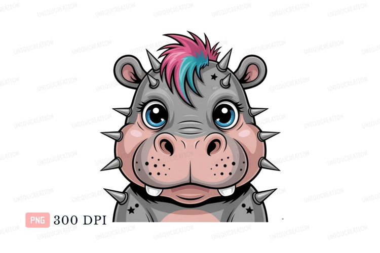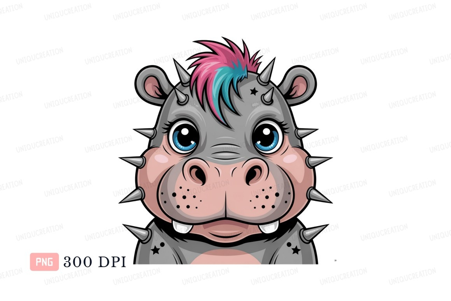 Illustration Cartoon Animal Pink Punk Blue Hair Grey Spikes Hippo