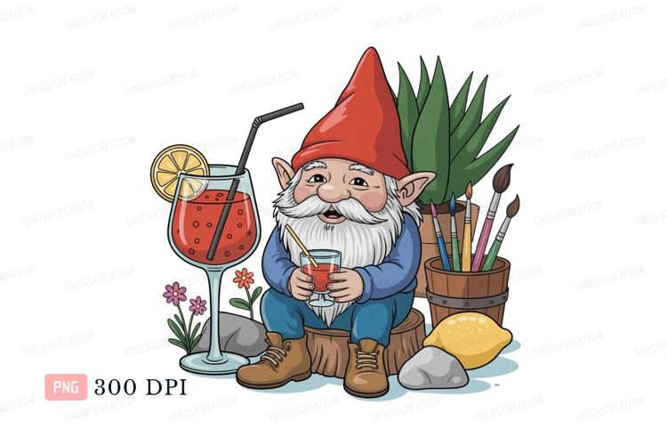 Gnome enjoying red drink with art supplies cocktail example image 1