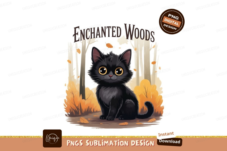 Fluffy black cat enchanted woods autumn