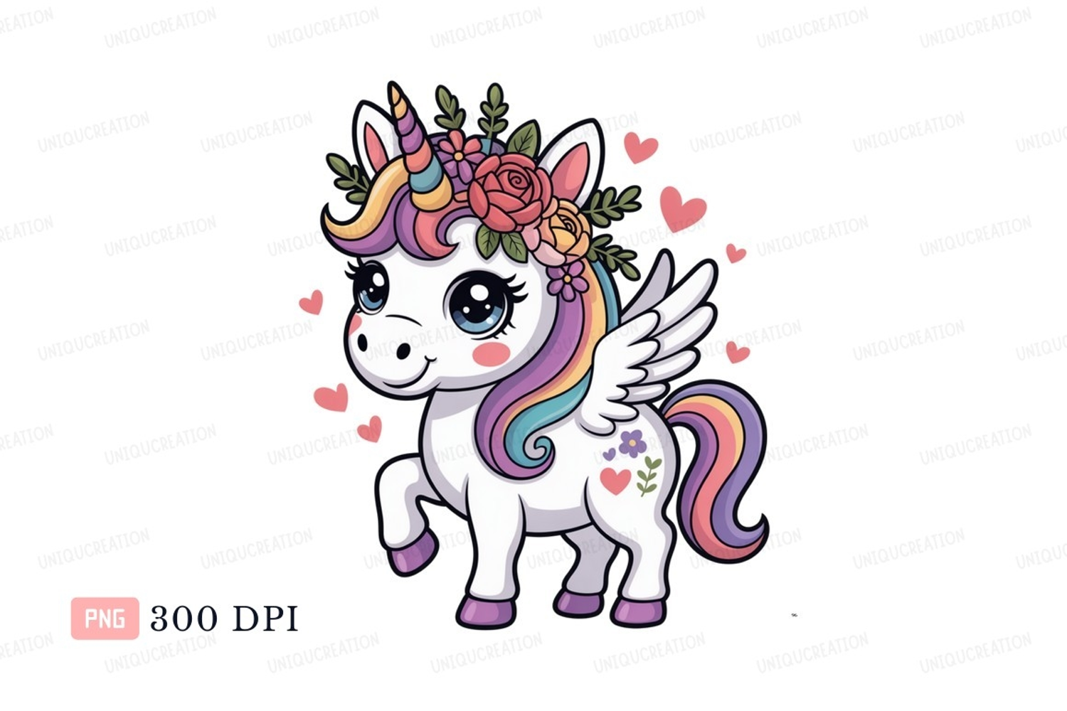 Cartoon Fantasy Whimsical Cute Hearts Floral Unicorn Rainbow Wings Magical