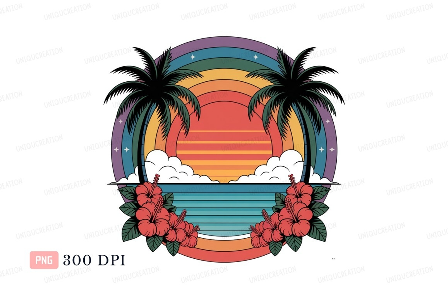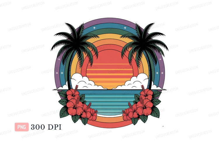 Vintage Retro Illustration Ocean Beach Clipart Sunset Hibiscus Tropical Palms