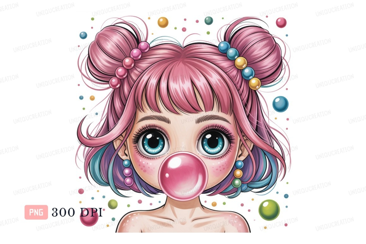 Pink haired girl blowing bubblegum blue eyes example image 1