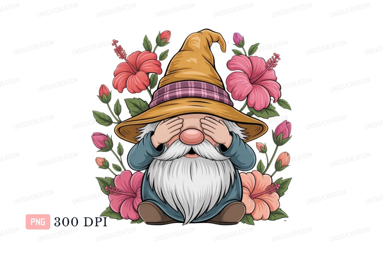 Gnome hiding eyes surrounded by hibiscus flowers example image 1