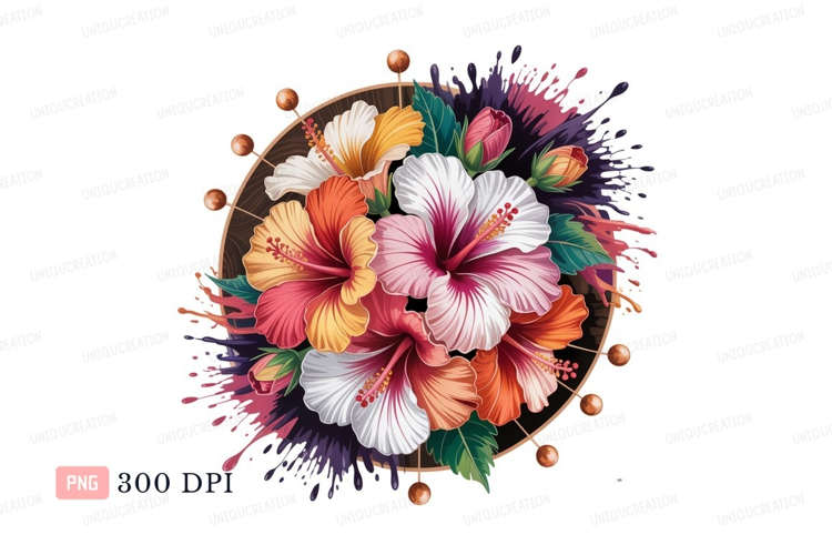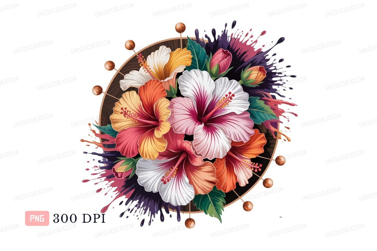 Colorful Floral Artistic Splash Leaves Hibiscus Buds Tropical Bouquet Petals