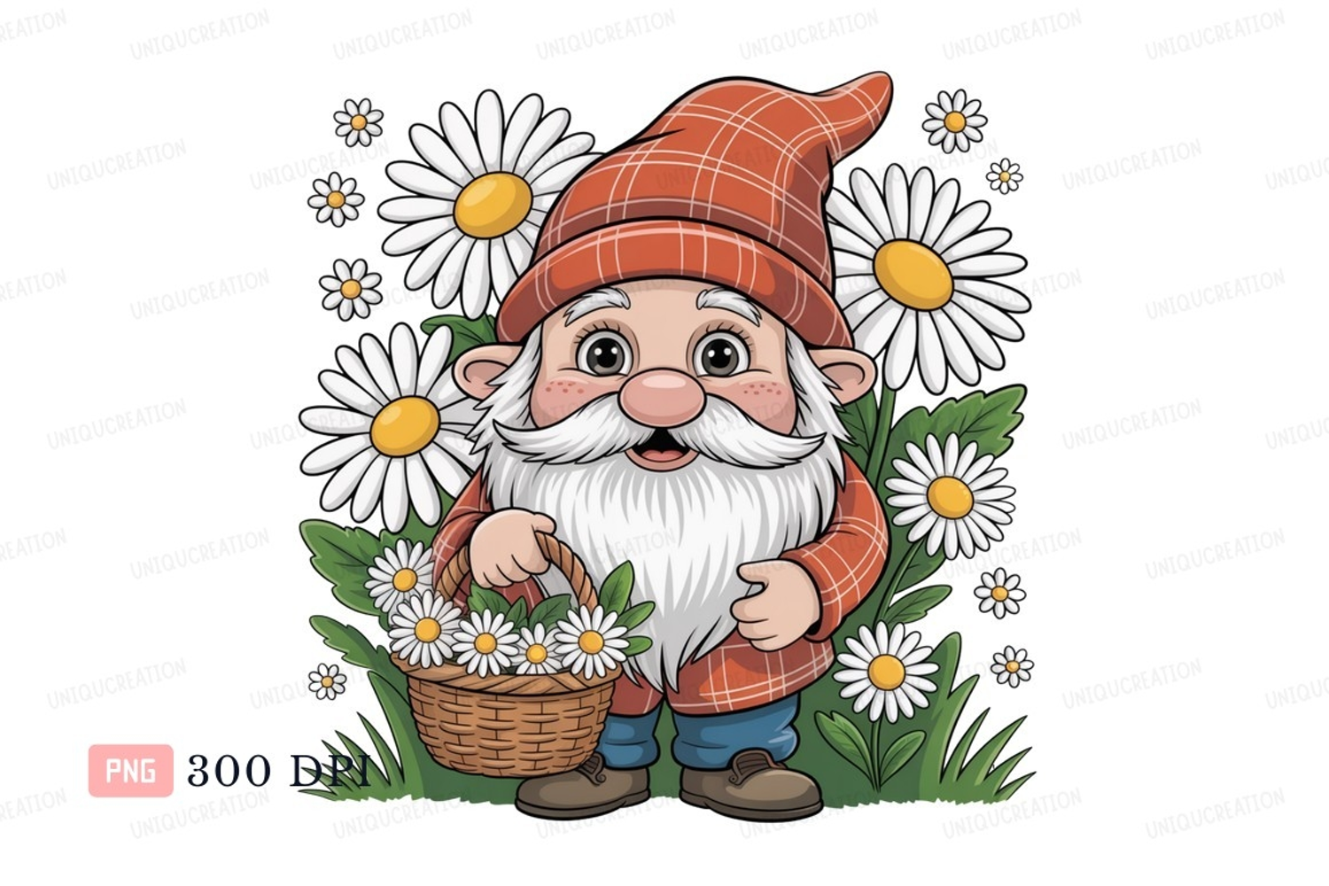 Cheerful gnome holding daisy basket flowers garden example image 1