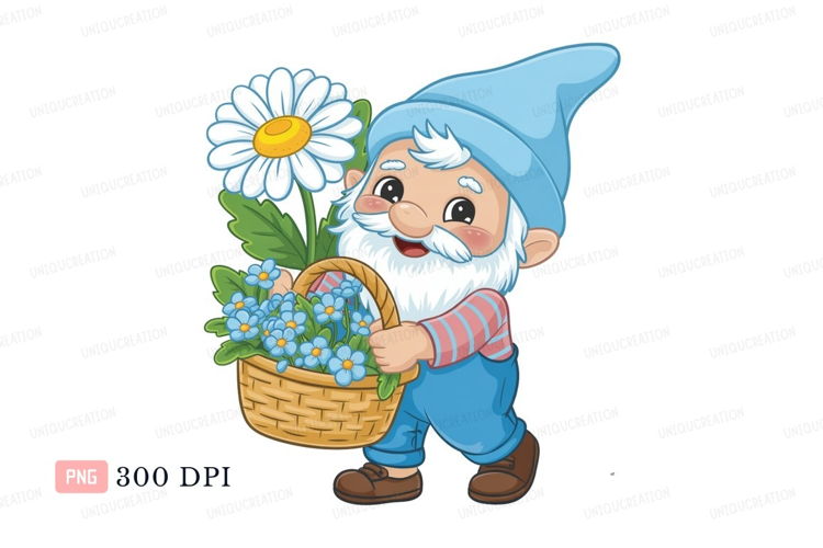 Cheerful gnome carrying basket of flowers blue white example image 1