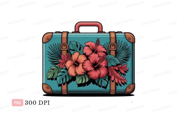 Teal suitcase with tropical flowers hibiscus travel example image 1