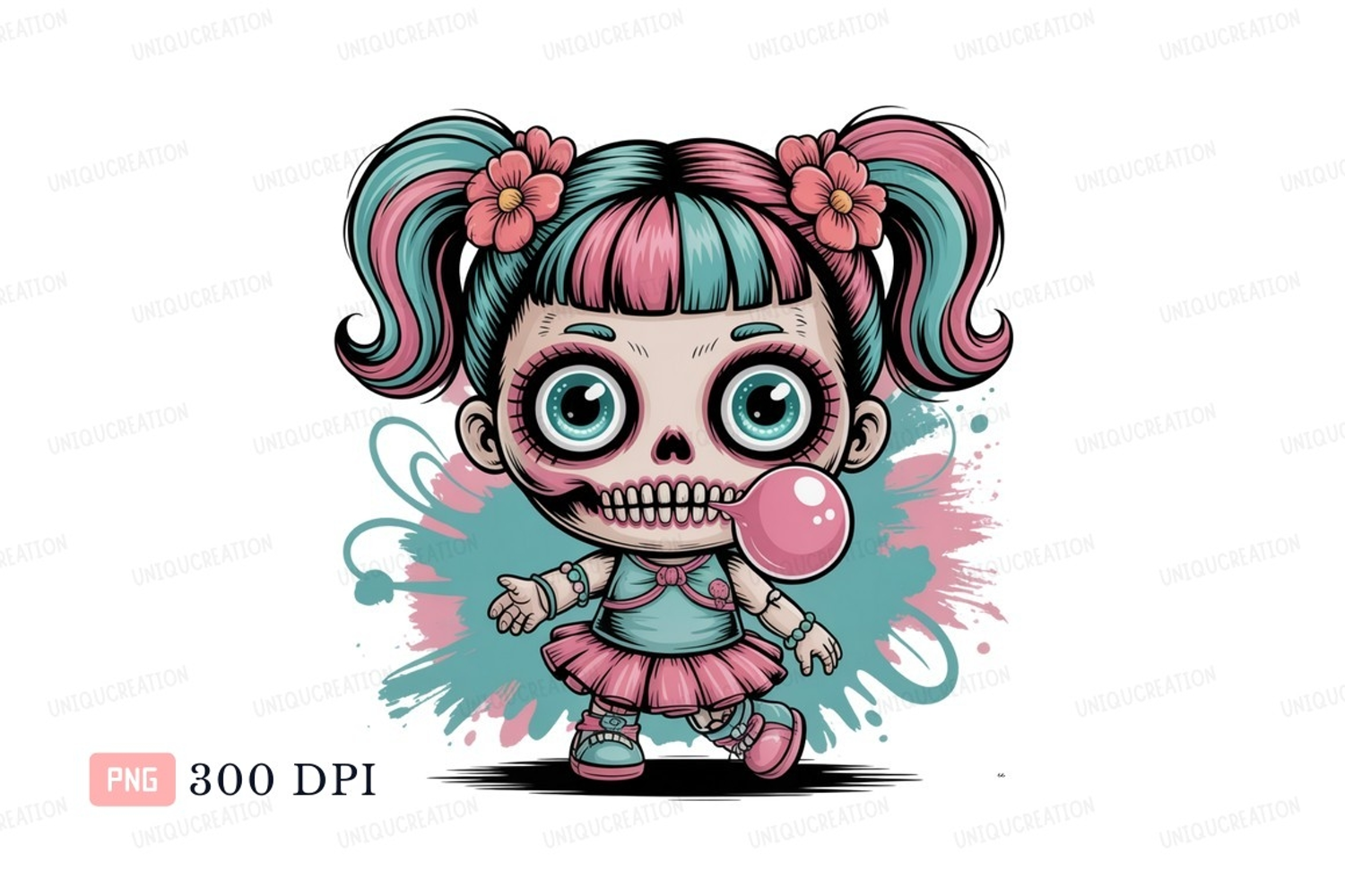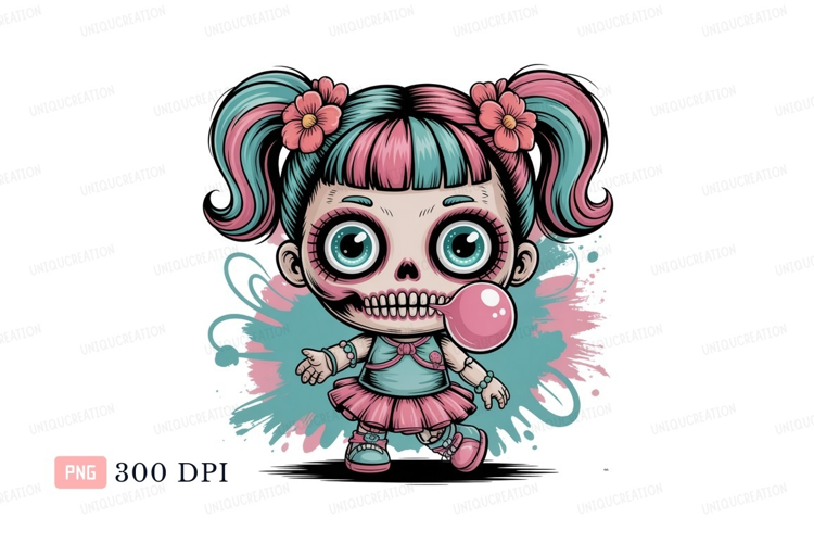 Pink Skull Girl Flowers Dress Blue Teal Skirt Bubblegum Pigtails