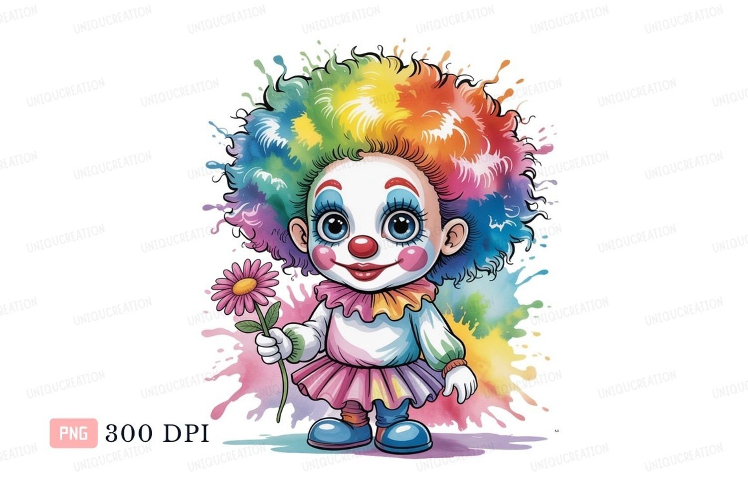 Colorful clown holding pink flower blue example image 1