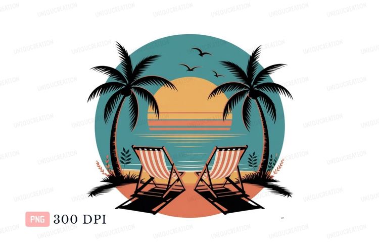 Ocean Birds Beach Sunset Orange Teal Trees Chairs Palm Striped