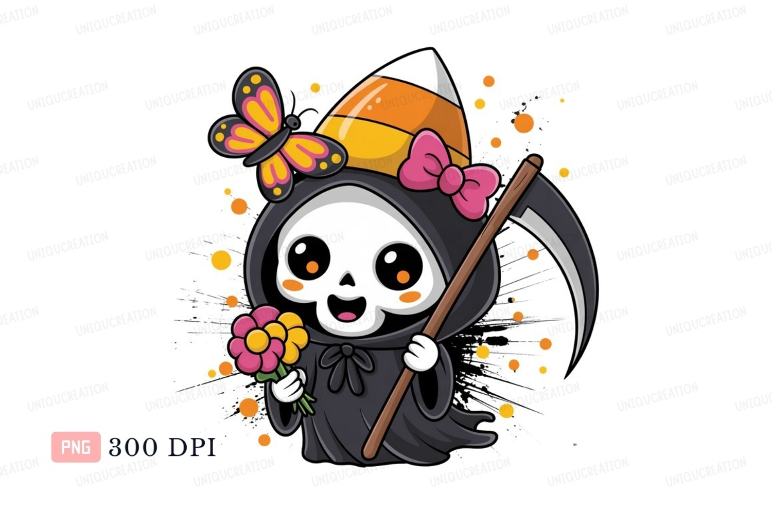Cute grim reaper with butterfly flowers and candy corn hat example image 1